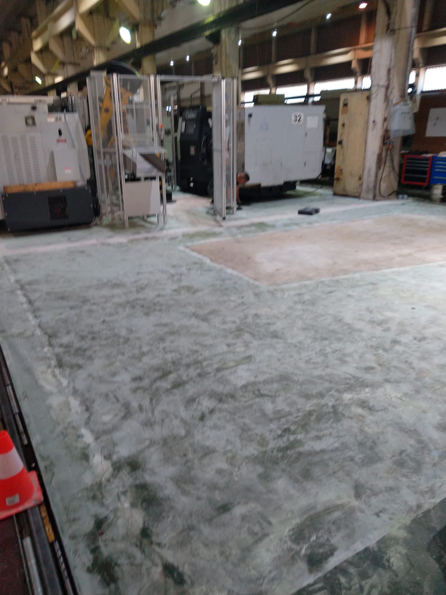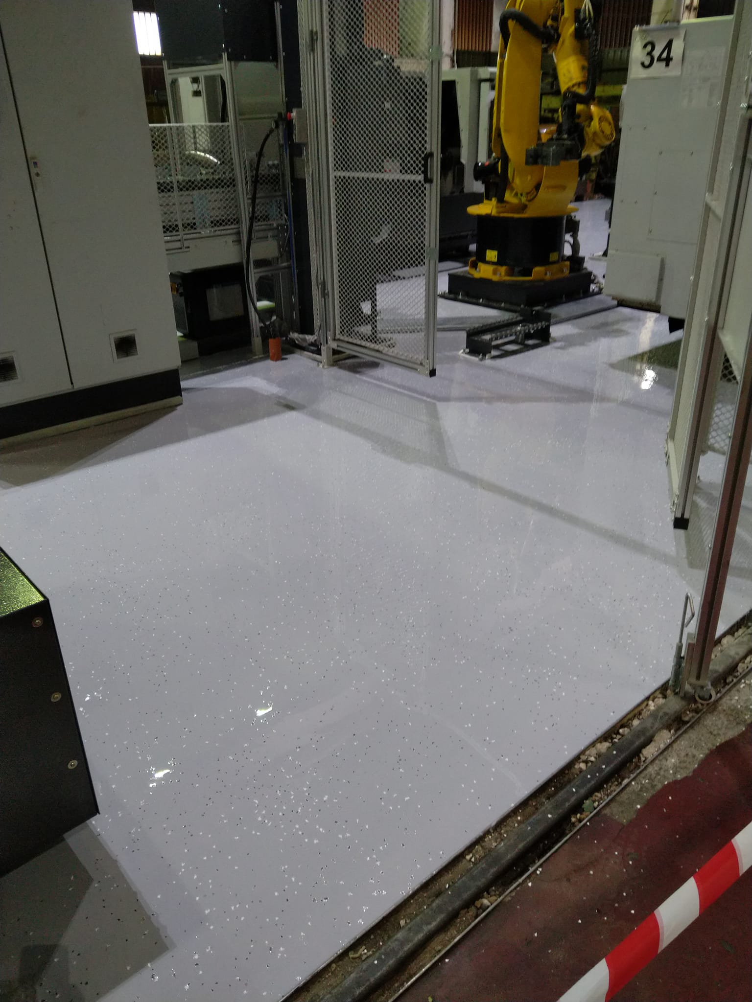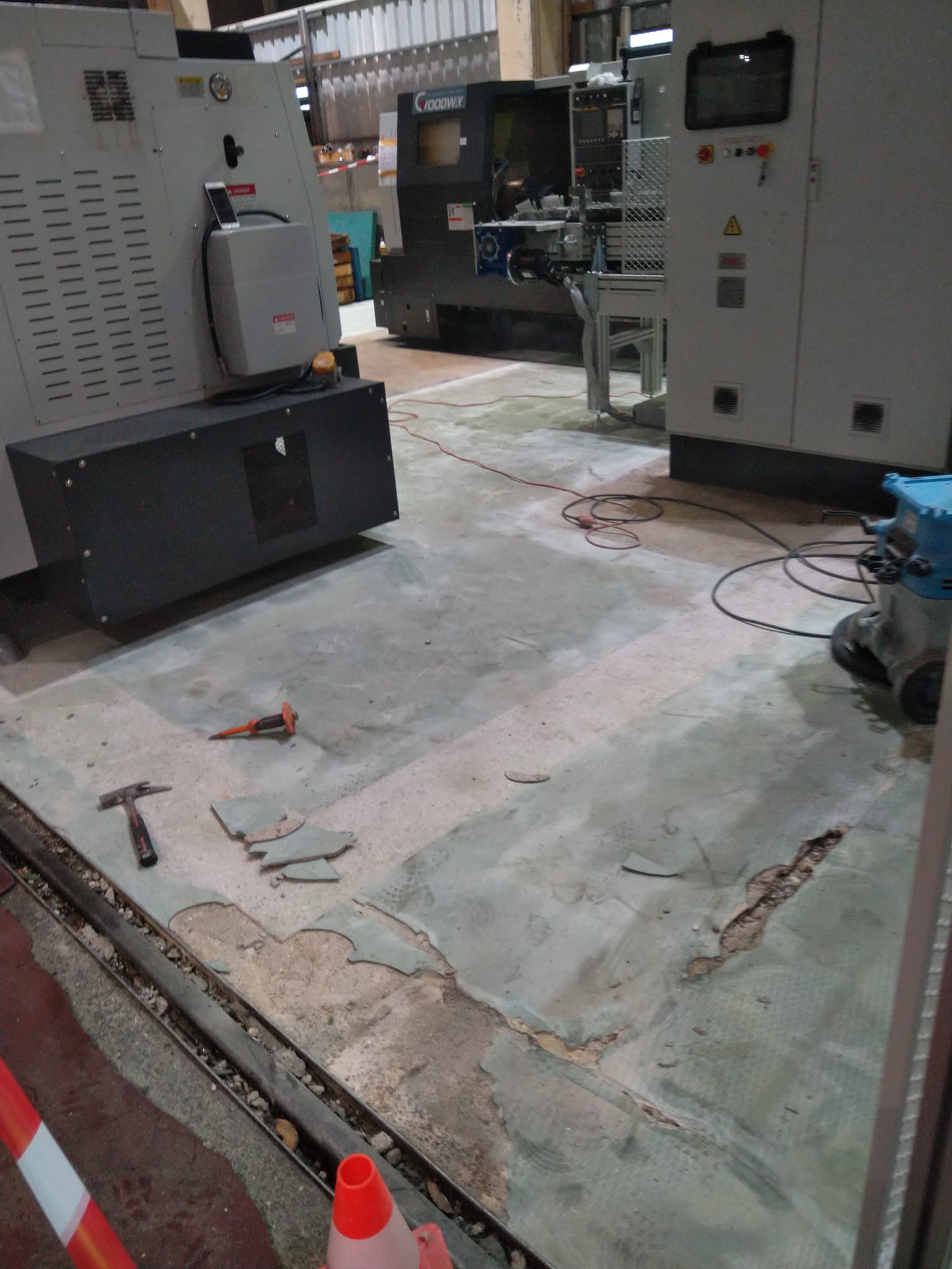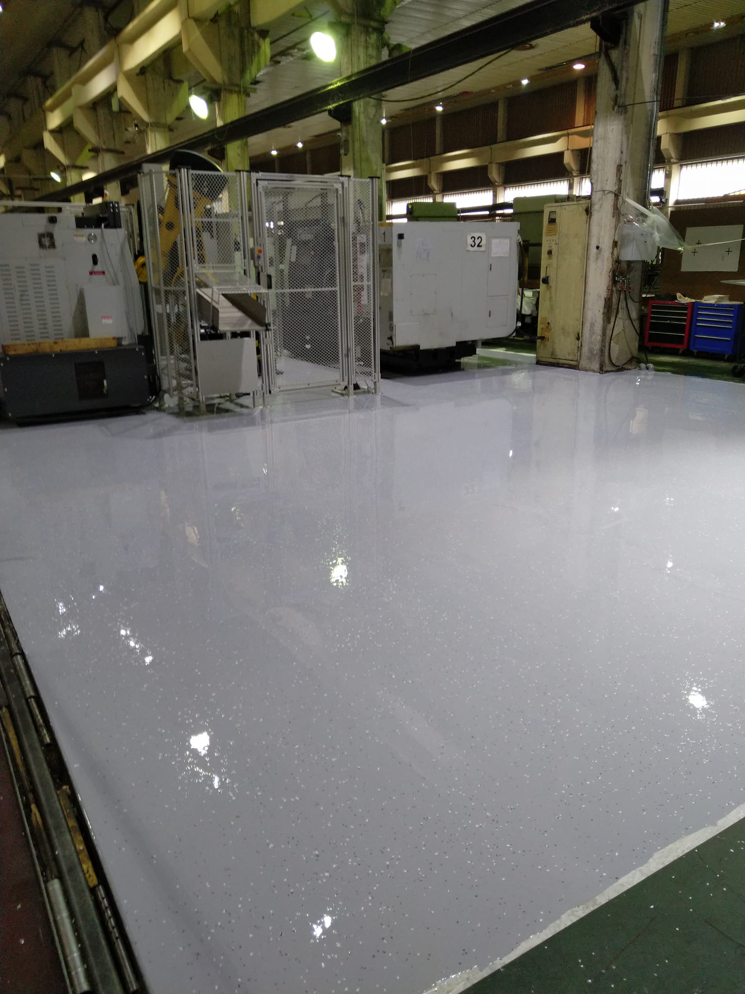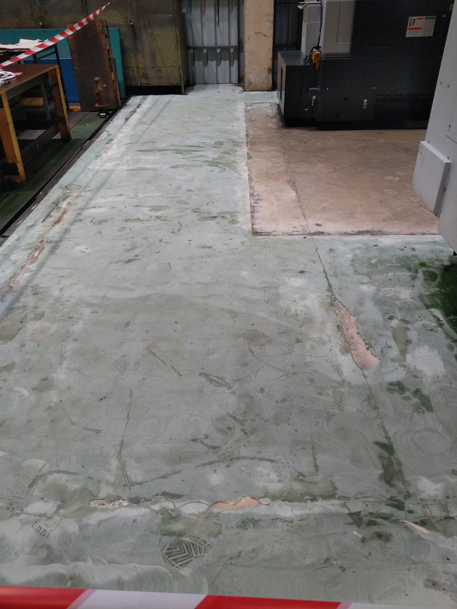 Реновиране на 40-годишен епоксидно-индустриален под с цел възстановяване на неговата функционалност и естетика. Процесът включва шлайфане на старата настилка, премахване на замърсявания и повреди, както и нанасяне на нов слой епоксидна смола с висока устойчивост на натоварване и химикали.